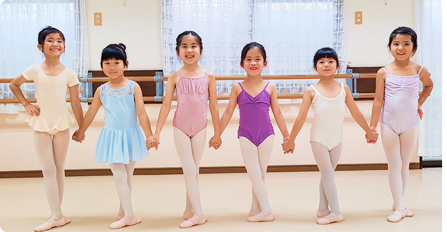 初等クラスではいよいよ、バレエの基礎となる動きやポジションを、少しづつ習い始めます。まだまだ小さな子どもたちの元気と無邪気さが溢れるこのクラスは、今後の本格的なバレエレッスンに向けた準備を整える段階です。